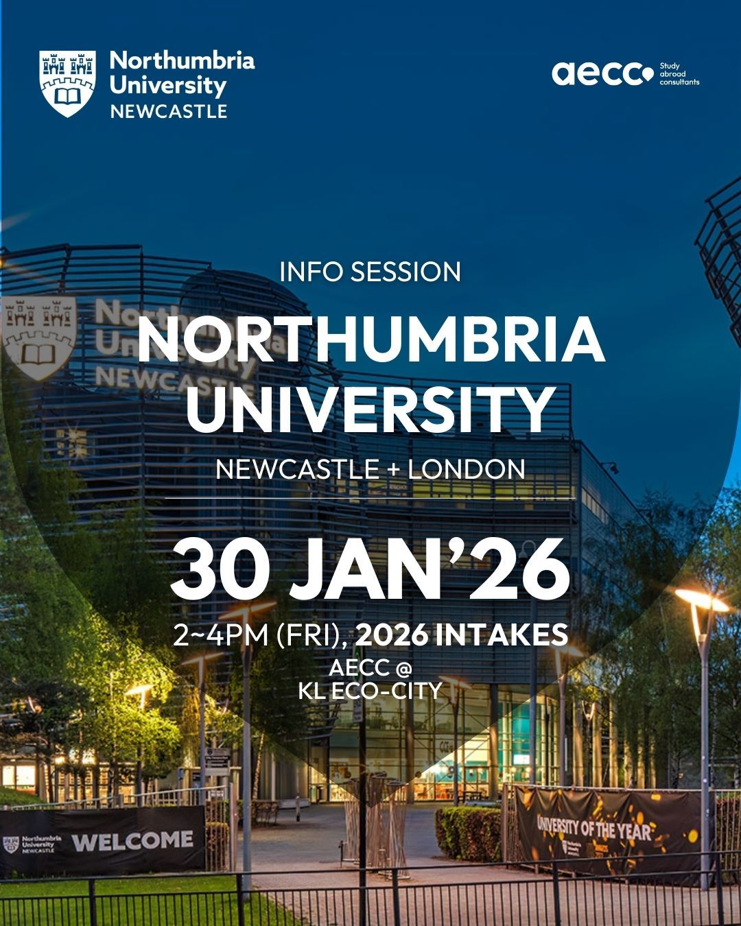 The info session is held at AECC, KL Eco-City Office on 30 of Jan 2026 from 2PM to 4PM. It is a physical 1-to-1 event designed for Malaysian students to meet university representatives directly.
